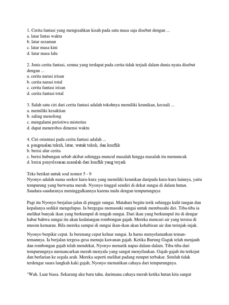 Biasanya berisi cerita kehidupan seputar istana. Cerita fantasi adalah cerita yang sepenuhnya dikembangkan berdasarkan khayalan, fantasi, atau imajinasi. Soal ulangan akhir semester genap kelas x multimedia materi fotografi dalam sajian multimediadeskripsi lengkap. Pemerintah kabupaten banyumas www.bukusoal.com situs tentang kumpulan soal sd, smp, sma, cpns dapat didownload gratis sepenuhnya milik anda. Contoh soal pas bahasa indonesia kelas 7 smp ini bisa dijadikan bahan referensi akan pembuatan soal naskah asli mendatang.